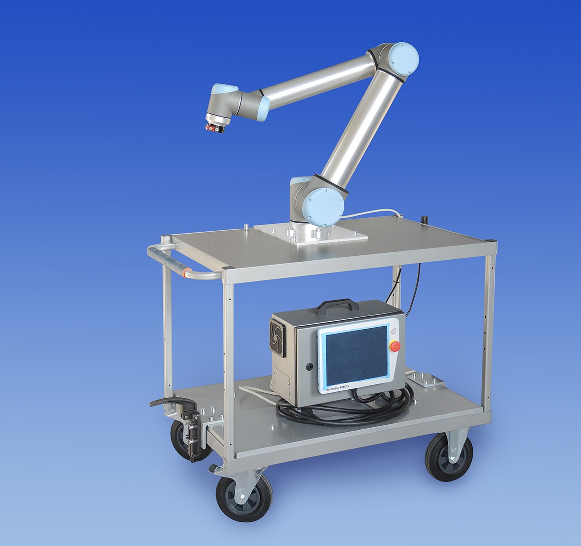 Ein UR10 Roboter von Universal Robots zum Lackieren von Teilen. Durch die Montage auf einem Wagen ist der Lackierroboter mobil und kann an verschiedenen Orten eingesetzt werden. Durch die geringe Geschwindigkeit beim Lackieren darf der Roboter ohne Zaun direkt neben einem Menschen arbeiten.